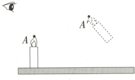 10.〔南阳模拟〕某同学做平面镜成像实验时,由于实验操作不当,人眼看到烛焰的像的情景如图,$A$是烛焰上的一点,$A'$是$A$的像。请画出平面镜的位置及$A$点发出的一条光线经平面镜反射后进入人眼的光路图。