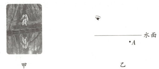 9.〔朝霞原创〕图甲为游客在安徽省黄山市西溪南湿地踏青赏景时的照片,此时游客仿佛在清澈的水中行走。请在图乙中画出拍照的摄影师看到游客头部在水中的倒影的光路图,其中$A$点表示游客头部在水中倒影的位置。