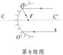 8. 教材图片改编 如图所示,焦点$F$处的点光源发出的任意一条光线$FO$经凹面镜反射后沿与主光轴$CC'$平行的方向射出。现有一条与$CC'$平行的光线$AO'$射向凹面镜。请作出$AO'$的反射光线,并标出其反射角$r$。