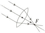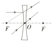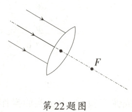 22.〔郑州市〕我国西汉时期的《淮南万毕术》中记载:“削冰令圆,举以向日,以艾承其影,则火生。”这是利用冰透镜对日聚焦取火的最早记载。假设$F$为冰透镜的焦点,请你在图中完成光路。