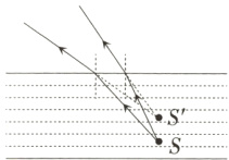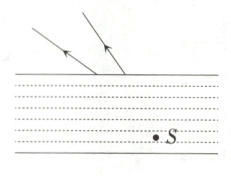 19. 如图所示,小明在清澈的湖边看到水中有一条小鱼,若小鱼的实际位置对应图中的$S$点。请根据光的折射原理,画出法线、小明眼睛看到小鱼的虚像$S'$和图中两条折线光线对应的入射光线。