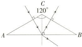 [解析]玻璃砖的截面为等腰三角形,顶角为120°,则由几何知识可得,光线经过界面AB反射后,反射角等于30°,则反射光线垂直于界面BC,故反射光线经过界面BC射入空气中时,传播方向不变;由光的折射规律知,光线经过界面AB折射后折射角大于入射角。