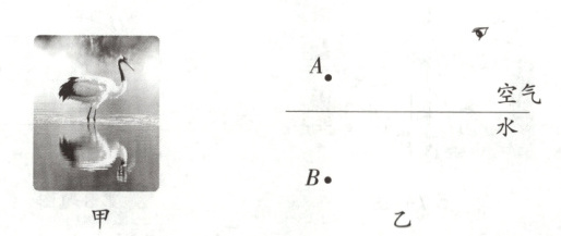20.〔郑州模拟〕在图甲所示的平静水面上,一只白鹤垂首的瞬间,水中“白鹤”的尖喙恰落在一条金鱼的背鳍上,水天之间诉说着奇妙的自然之美。请在图乙中画出游客看到这一现象的光路图。(点$A$是白鹤的喙,点$B$是水中金鱼的背鳍)