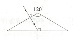 21. 如图所示,一条光线从透明玻璃砖的一面垂直入射,玻璃砖的截面为等腰三角形,顶角为$120°$,请结合几何知识画出这条光线经玻璃砖从另外两个面射出的光路图。