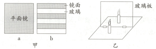 (1)第一小组找到图甲所示的两种器材,器材$a$是平面镜,器材$b$是在薄玻璃板的一面贴上几条镜面纸的自制教具。为了确定像的位置,可选择器材