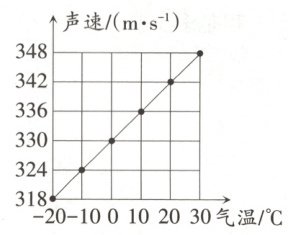 7. 日常生活情境 烟花秀 岁末年初,大型烟花秀在海内外接连上演。小明全家一起前去观看跨年烟花秀,小明看到烟花在空中爆炸后约3 s才听到声音,小明查看手机天气软件,温度显示为10 ℃,下图为声速和气温的关系图。求:(烟花爆炸时发出的光传播到人眼的时间忽略不计)