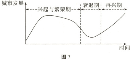 印度尼西亚的沙哇伦多是十九世纪末因荷兰人开采煤炭而兴起的一座城市,吸引了印度尼西亚不同地区、不同民族的人口迁入。随着该地区煤炭资源枯竭,城市发展陷入困境。为摆脱困境,该城市依托煤炭开采的遗产发展旅游业,逐渐成为印度尼西亚著名的采矿文化旅游城市。图7示意沙哇伦多城市发展生命周期。