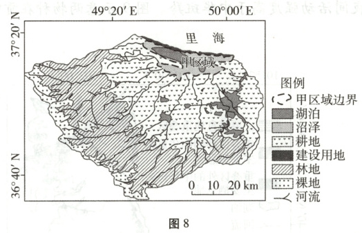 湿地包括湖泊、沼泽、河流等类型。甲区域曾是里海的一部分,现为淡水湿地,有狭窄水道与里海相连。该湿地流域位于伊朗北部,年均降水量超过1000毫米。据预测,21世纪60年代该湿地将全部变为沼泽。图8示意该湿地位置及湿地流域的土地利用状况。