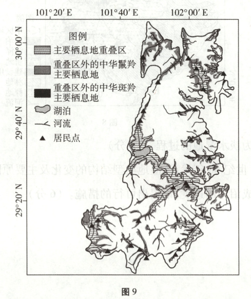 四川贡嘎山国家级自然保护区位于青藏高原东缘,野生动植物丰富,是国家级风景名胜区。中华斑羚和中华鬣羚是近缘物种,主要栖息地为针叶林和针阔混交林,在贡嘎山和秦岭均有分布。两物种日活动高峰都出现在清晨和傍晚,但中华鬣羚的活动早高峰早于中华斑羚,晚高峰晚于中华斑羚,且夜间活动强度高于中华斑羚。图9示意两物种在贡嘎山自然保护区主要栖息地的分布。