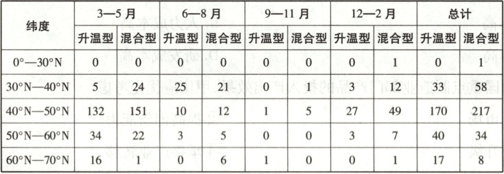 融雪洪水灾害由大量的积雪快速融化引起,可分为雨雪混合型(简称“混合型”)洪水灾害和升温融雪型(简称“升温型”)洪水灾害,融雪洪水中常夹杂着冰凌和融冰。表1示意1900—2020年北半球融雪洪水灾害频次。据此完成11—13题。
