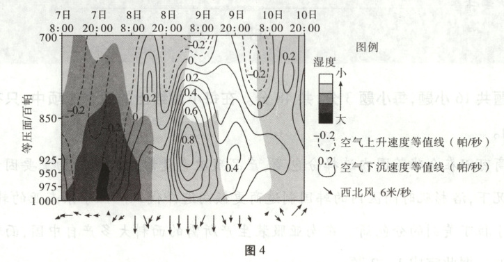 解题思路读图可知,7日20:00至9日20:00,该地不同高度空气垂直运动方向不同;此时段该地空气湿度逐渐降低,空气当中的水汽以向外输出为主;此时段该地垂直气流的强弱与湿度大小变化不一致;此时段该地空气以下沉运动为主时,下沉气流较强,此时近地面风速较大。