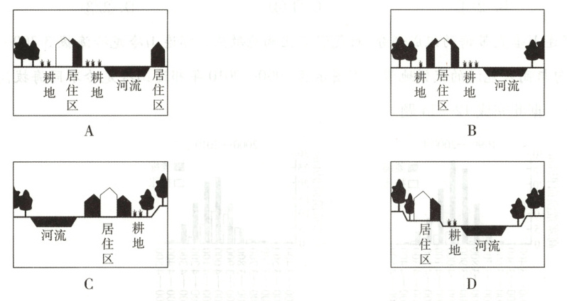 解题思路 读图可知,屿北村位于河流一侧,而A选项中,河流两侧都分布有居住区,不符合题意;屿北村坐落在山麓河谷地带,居民区靠近河流分布,耕地位于居民区和林地(山地)之间地势相对平坦的区域。故C项正确。