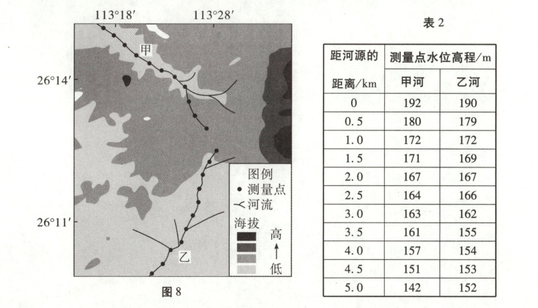 甲河与乙河发源于某山地两侧(图8)。某科研小组调研发现,甲河流经地区的岩石节理发育、压实和成岩作用相对较弱。表2示意两条河流河源段测量点的水位高程。