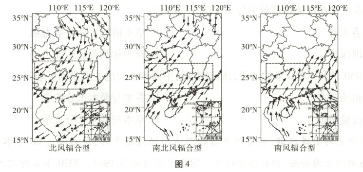 根据关键区域(虚线框内)风场辐合情况,冬季强华南准静止锋可分为三类。图4示意三类冬季强华南准静止锋及其850百帕等压面上≥4m/s的风场。据此完成9—10题。