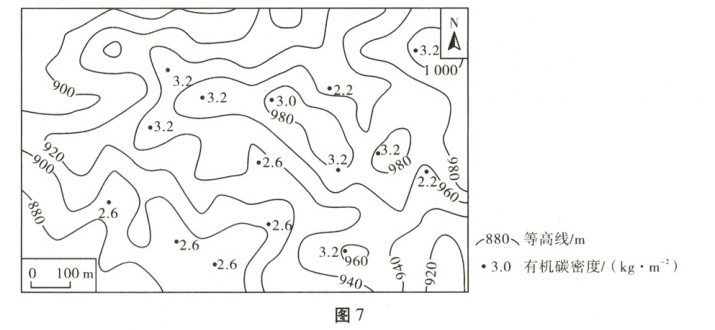 土壤有机质包括腐殖质、生物残体等,大多以有机碳的形式存在。土壤有机碳密度是指单位面积内一定深度的土壤有机碳储量。海南岛某自然保护区内保存着较完整的热带山地雨林,此地常受台风影响。图7示意该保护区内一块样地的地形及该样地内部分点位土壤表层(0—10厘米)的有机碳密度(单位:kg·m⁻²)。