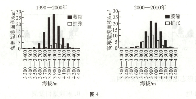 解题思路 读图可知,1990—2000年和2000—2010年两个时间段祁连山冷龙岭不同海拔高寒荒漠总体以萎缩为主(萎缩数值高于扩张数值)。与1990—2000年相比,2000—2010年萎缩和扩张的差值趋于减小,反映高寒荒漠总面积萎缩趋缓;其可能的原因是高寒荒漠对气温变化响应敏感,气温上升使交错地带下部的高山草甸向高海拔扩张,由于气温升高的幅度减小,高寒草甸生长的速度变慢,进而使高寒荒漠被挤压和替代的速率降低,因此高寒荒漠总面积的萎缩趋势变缓。故A项正确。