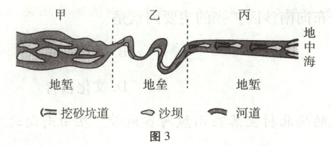 塞尔韦拉河是西班牙东部的季节性河流,全长44千米,中下游流经三个地质构造单元。下游河道因过去开采砂砾破坏严重,后来政府对开采行为进行了限制,河道缓慢恢复。下图示意该河流中下游甲、乙、丙三个河段的河道形态。据此完成9—11题。