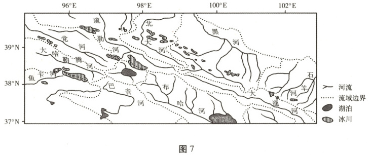 (1)根据冰川面积大小及分布状况,推测疏勒河流域与北大河流域冰川分布区的地形差异。(4分)
