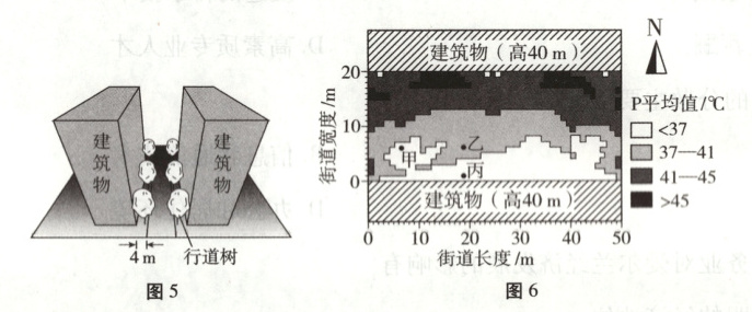 中欧地区城市夏季常出现热浪天气,街道两侧建筑物和树木的阴影可缓解行人的热感,行人热感可用生理等效温度(P)衡量。图5示意中欧地区某市(48°N,8°E)一条东西向街道行道树布置,图6示意该街道某年夏至日(天气晴朗、风力微弱)当地时间9—15时P平均值的分布。tan65.5°≈2.19。据此完成15—16题。