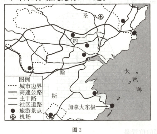[2025·江苏卷,4—6T,6 分]加拿大最东端的斯比尔角被称为“加拿大东极”,是圣约翰斯市热门旅游景点。图 2 为圣约翰斯市旅游简图。据此完成 3—5 题。