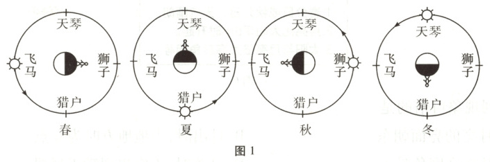 解题思路 读图可知,自春季到冬季,太阳在星空背景中自西向东移动(与地球公转方向一致),①错误,②正确;图中太阳视运动轨迹以恒星(飞马、猎户、狮子、天琴)为参照物,完成一周运动对应地球公转$360^{\circ}$,其周期是一个恒星年,③正确,④错误。故C项正确。