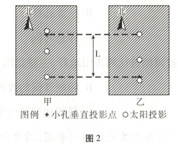 [2025·浙江1月卷,24—25T,4分]甲、乙两地天文爱好者进行太阳高度观测。具体做法:在平坦地面上方水平放置一块有一个小孔的遮光板,太阳光透过小孔投影到地面上,形成较清晰的太阳投影。下图为两地天文爱好者在二分、二至日正午时刻,在同高度用相同遮光板观测到的太阳影像地面投影。据此完成6—7题。