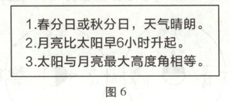 解题思路 根据上题分析可知,此日月亮比太阳早6小时升起,说明此日月亮为子夜升起,可判断月相为下弦月。下弦月子夜升起,中午月落,月出至日出之间可见月影,可见月影时,月亮应位于东半部天空,月影朝西;日出以后太阳辐射增强,月影不可见,图②符合要求。故B项正确。