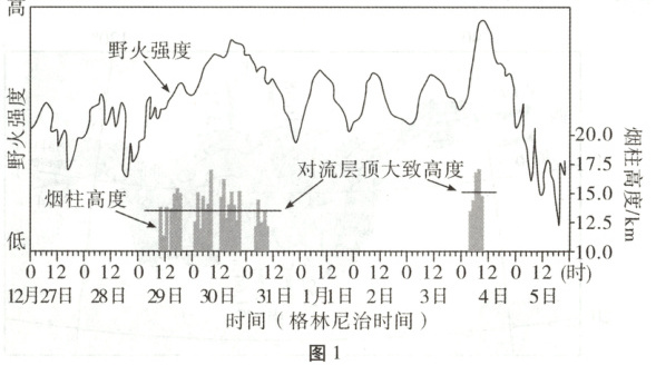 [2025·安徽卷,14—16T,9分]2020年1月1日前后,澳大利亚东南部发生大面积高强度森林野火,引发强烈上升气流,在一定的天气形势下,烟尘上升至对流层顶附近,形成积雨云状烟柱。图1表示该区域野火强度与积雨云状烟柱高度随时间变化情况。据此完成1—3题。