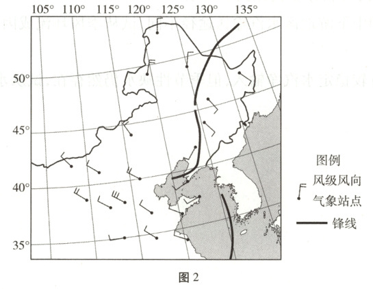 [2025·河北卷,10—12T,9分]2025年4月中旬,我国部分地区经历了一次大风天气过程。图2示意这期间某日14时的锋线位置和部分气象站点风级、风向。据此完成4—6题。