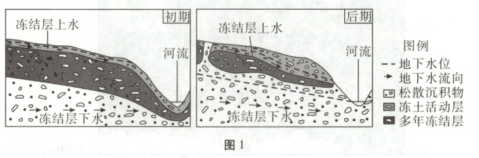 [2025·黑龙江卷,9—10T,6分]某河发源于祁连山脉,其河源区分布的厚层松散沉积物构成了地下水的主要含水层。长期监测发现,随着气候变暖,冻土退化导致地下水的存储、运移及出露发生变化。图1为监测初期和后期该河河源区河谷剖面示意图。据此完成1—2题。