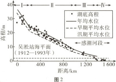[2025·广东卷,15—16T,6分]长江中下游地区湖泊众多,这些湖泊历史上多与长江自然连通。图2示意自长江中游沙市水文站至感潮河段多个沿江湖泊湖底高程(湖面高程减去平均水深后的高程值)及其与长江水位高程的对比关系。据此完成3—4题。