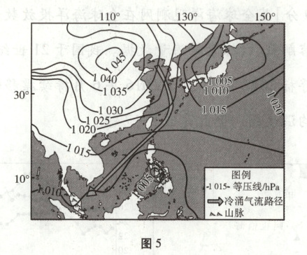 通常把中高纬大陆冷空气突然向南爆发,南海一带东北风迅速加强的现象称为“冷涌”。2021年12月15—20日,南海一带经历了一次强冷涌过程,马来西亚出现了持续性强降雨天气。图5表示北京时间12月17日8时海平面等压线分布,图中箭头示意此次冷涌气流移动路径。
