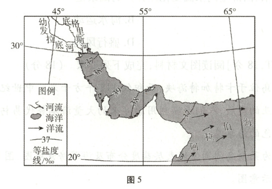 解题思路 读图可知,在河流入海口处,表层海水盐度为37‰,从河口到波斯湾,表层海水盐度逐渐上升到39‰,由波斯湾到阿拉伯海,表层海水盐度逐渐递减到37‰,因此,从河口到阿拉伯海,表层海水盐度先经历了一个上升的过程,达到峰值后又有所下降,C项正确;根据海水盐度分布可知,从河口到阿拉伯海,表层海水盐度数值并非单调递增、递减或先降后升,A、B、D项错误。