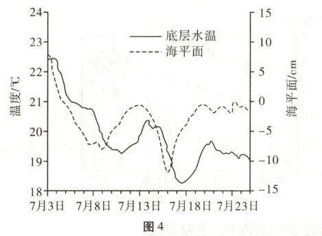 [2024·福建卷,6—7T,6分] 位于海南岛东面大陆架的海底观测站(水深38米)观测到的底层水温及其海平面变化见图4(不考虑天文潮汐的影响,取观测站观测的海平面平均值为海平面零面)。据此完成5—6题。