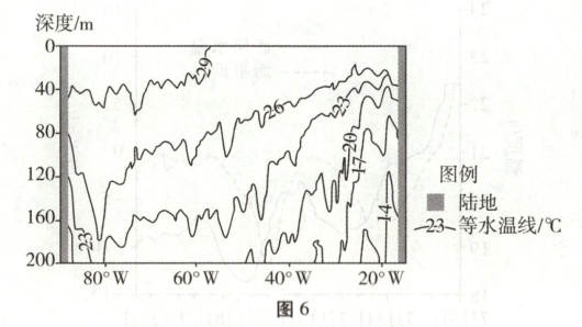 [2024·河北卷,8—10T,9分] 飓风是生成于热带或副热带暖水海域的强低压中心。北大西洋热带海域西部飓风生成较多而东部较少。图6示意某年9月北大西洋热带海域沿18°N的水温分布。据此完成9—11题。