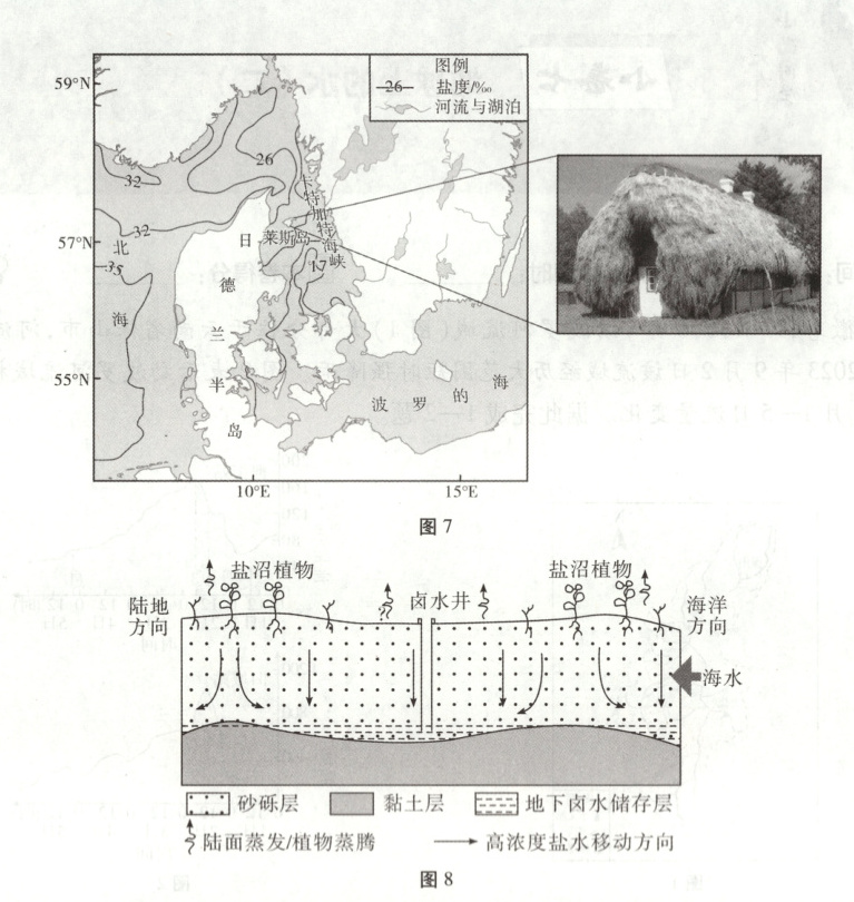材料二 图7为莱斯岛周围海域表层盐度分布及海草房景观图,图8为莱斯岛地下卤水形成与储存地质剖面示意图。
