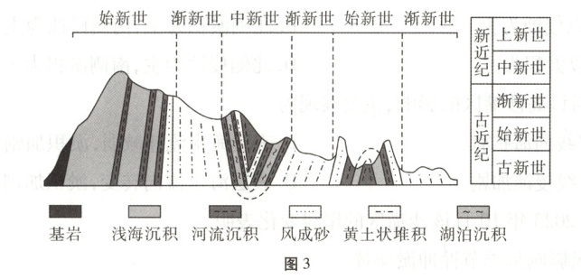 解题思路 图中自始新世至中新世地层均发生了弯曲变形现象,说明褶皱发生的时间晚于中新世,A项错误;图中显示,始新世晚期出现风成砂地层,而始新世早期当地为海洋环境,说明始新世晚期气候趋于干旱,B项正确;图中渐新世及之后的地层中已无浅海沉积,说明古海洋退出时间早于渐新世,C项错误;渐新世主要为黄土状堆积地貌,黄土堆积是风力沉积的结果,说明此时期当地气候干旱,风力作用强烈,流水侵蚀作用较弱,D项错误。