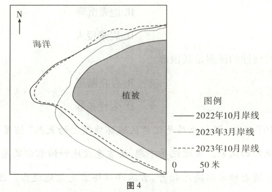 [2025·湖北卷,10—12T,9分]西北太平洋某珊瑚岛礁属热带季风气候,呈长条形,沙堤环绕,植被繁茂。该岛沙嘴区受盛行风主导呈季节性变化,亦受波浪和潮汐作用。此外,极端风暴事件也会对沙嘴区造成重要影响。移动固沙障根据需要灵活布设。图4示意2022年10月—2023年10月该岛沙嘴区的岸线变化。据此完成9—11题。