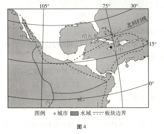 解题思路 读图可知,图中陆地区域为美洲中部地区,图中有两种板块边界,结合所学知识可知,甲、乙、丁三地附近为板块消亡边界,丙附近为板块生长边界,此次地震震中位于板块消亡边界附近,B项正确;大西洋中脊位于美洲板块、亚欧板块和非洲板块的交界处,此次地震震中位于美洲板块内部,A项错误;震源的位置属于美洲板块,不属于太平洋板块,C项错误;地震会引发海啸,但图中显示哈瓦那位于岛屿北部的沿海地区,由于岛屿阻挡,海啸对哈瓦那的影响相对较小,D项错误。