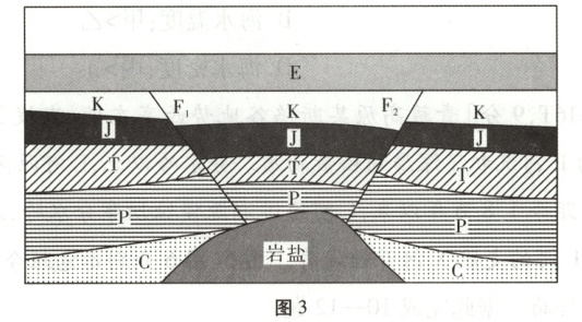 [2025·河北卷,15—16T,6 分]同生断层是伴随地层沉积过程而生长的断层,即地层边沉积,断层边生长,因此,同生断层两盘的同期地层相比,下降盘厚度大。图 3 示意盐丘上部的地堑构造,岩盐在 P 形成后上拱并先后刺穿 C 以及 P 下部,导致断层 F₁ 和 F₂ 的初始形成;其后 F₁ 和 F₂ 的构造活动具有同生断层性质。据此完成 5—6 题。