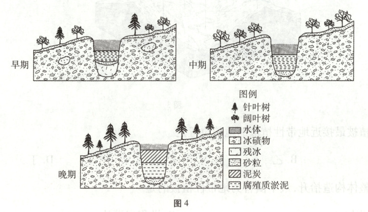 (1)问,早期区域内针叶林和阔叶林共存,以阔叶林为主,说明气候较暖。中期完全演变成阔叶林,说明气候变暖。晚期则完全演变成针叶林,同时结合晚期巨厚的泥炭层可以判断此时气候转冷。由此可以推断该湖所在区域末次间冰期的气候变化规律为先变暖,后变冷。第