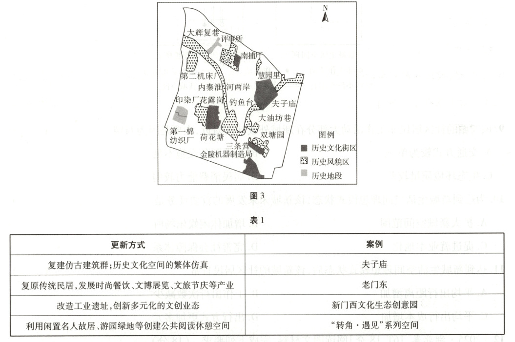 [2025·安徽卷,6—8T,9分]老城南地区位于南京市内城南部,经过持续更新改造,已成为城市新名片。图3示意老城南地区历史要素的空间分布,表1为老城南地区四种更新方式及案例。据此完成6—8题。