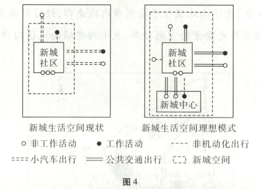 解题思路 结合所学知识可知,新城规划的主要目的是疏解中心城区功能,且往往布局在城市原郊区。图示新城的社区居民现阶段非工作活动大部分在新城外或社区附近,而新城内部的非工作活动缺乏,最有可能是因为该新城目前处于开发前期阶段,只有较为单一的居住属性,商业、医疗等生活配套设施发展滞后,新城居民的非工作活动只能依赖小汽车等交通工具到新城以外的老城区进行。故B项正确。