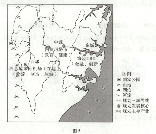 (2)问,本问可结合西城交通、政策、土地面积、生态环境等方面的优势进行分析。读图可知,在建的西悉尼国际机场形成了陆空联运枢纽,使得西城对外联系便捷,便于发展航空物流、高端制造及商务旅游等空港配套产业;根据材料“悉尼都市区规划于2018年发布”可知,政府对西城新中心建设资金投入高,政策支持力度大;读图可知,西城可开发土地相对多,利于规模化新城建设;此外西城位于河流上游,靠近山地,水资源丰富,生态环境优美,有利于旅游业发展,且宜居性强,适宜建设成为悉尼都市区新中心。第