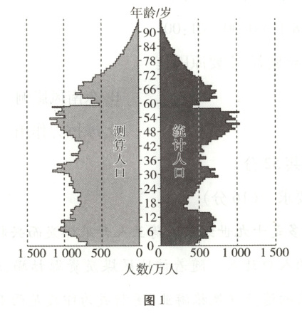 某学者以2010年常住人口为基础,在不考虑城乡人口迁移的条件下,测算出2020年我国乡村各年龄段常住人口数量。图1示意2020年我国乡村常住人口的测算结果与统计结果。据此完成4—5题。