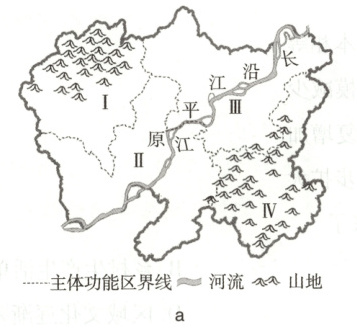 解题思路 由图a可知,Ⅰ区位于山区,通常情况下,与平原区相比,山区人口密度小,经济发展水平较低,城镇化水平低,A项错误;Ⅱ区位于沿江平原,地势平坦,土壤肥沃,适合粮食生产,为粮食生产基地,B项正确;Ⅲ区位于河流下游,河流落差小,水能资源不丰富,不适宜建设水电站,可推测Ⅲ区水电站数量少,C项错误;Ⅳ区山地面积广,但山区往往经济和科技水平低,生态环境比较脆弱,故Ⅳ区环境承载力较小,D项错误。