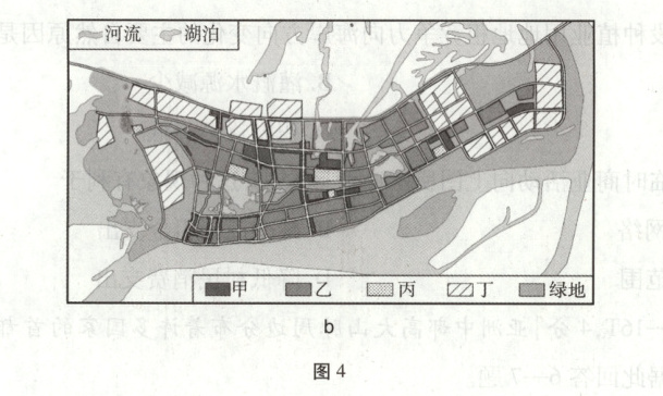 解题思路 由图b可知,甲功能区占地面积较小,位于市中心或街角路口,应该是商业区;乙功能区位于商业区外围,分布广泛,占地面积最大,应该是居住区;丙功能区位于市区,占地面积较小,结合选项分析,丙功能区应该是行政区;丁功能区位于市区外缘,最有可能是工业区。故A项正确。