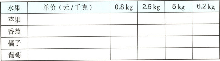 | 水果 | 单价(元/千克) | $0.8 kg$ | $2.5 kg$ | $5 kg$ | $6.2 kg$ |