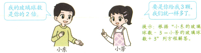提示:根据“小东的玻璃球数$- 3 =$小芳的玻璃球数$+ 3$”列方程解答。