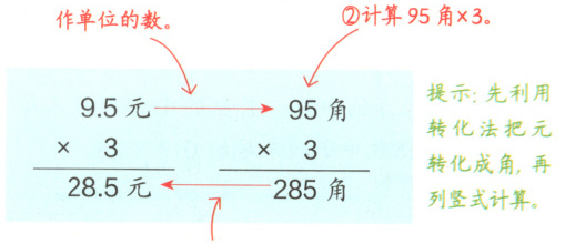 转化思想:小数乘整数,可以结合具体的量转化单位,先把小数转化成整数,再按照整数乘法的计算方法进行计算。